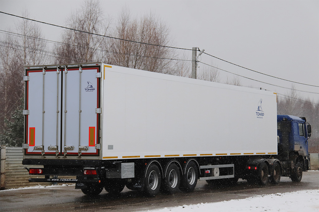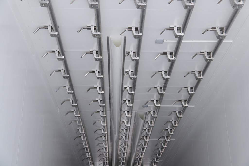 Кузов полуприцепа Тонар-9746Т усиленный для транспортировки мясных туш в повешенном состоянии.