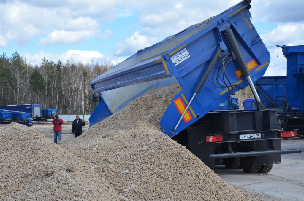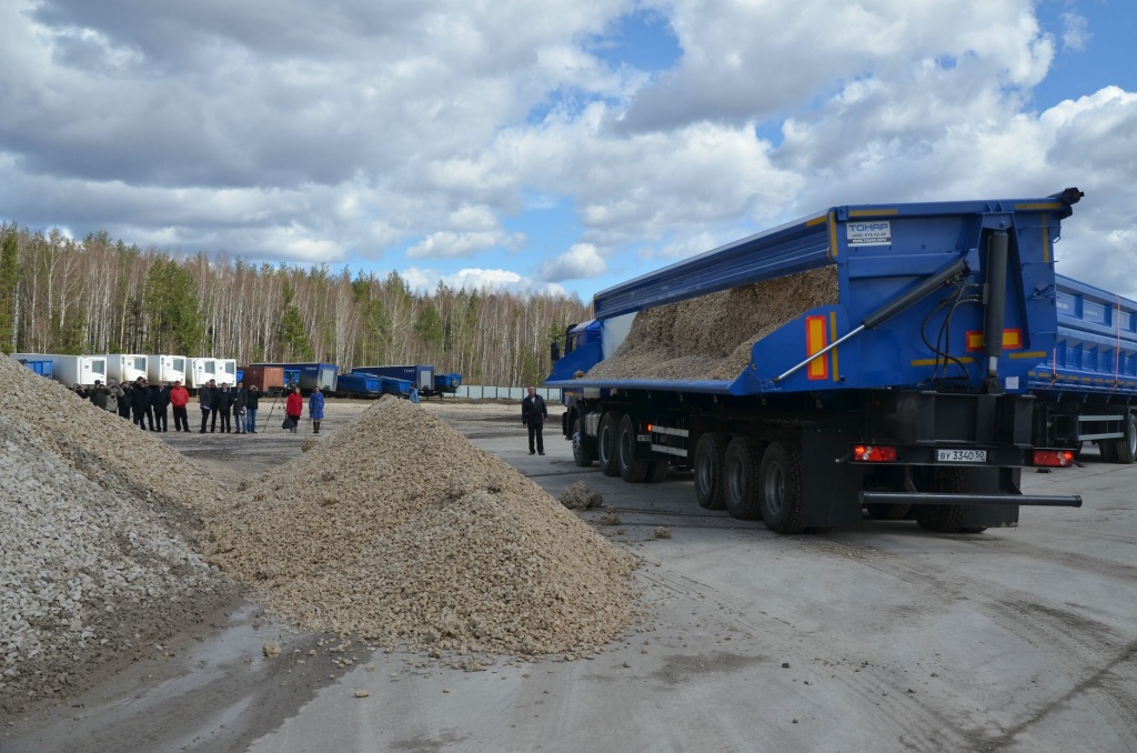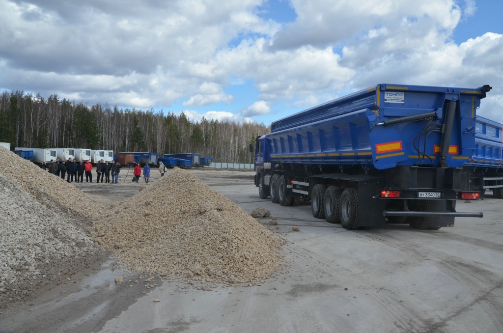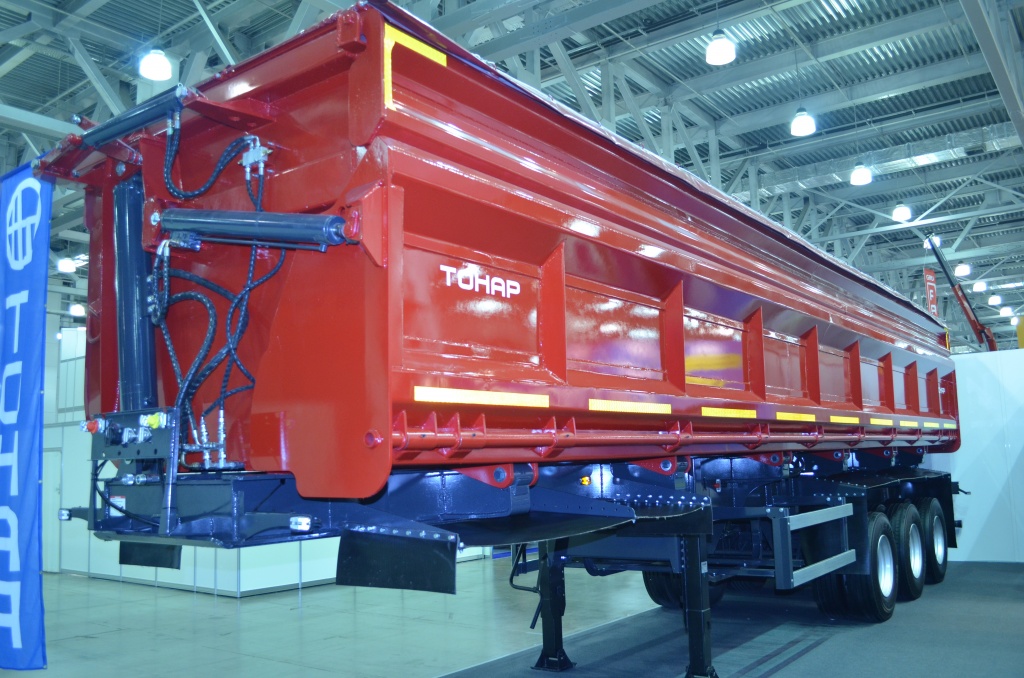 Полуприцеп-самосвал с боковой разгрузкой. Объём кузова 40 куб.м. Разгрузка может происходить в ограниченном по высоте пространстве.
