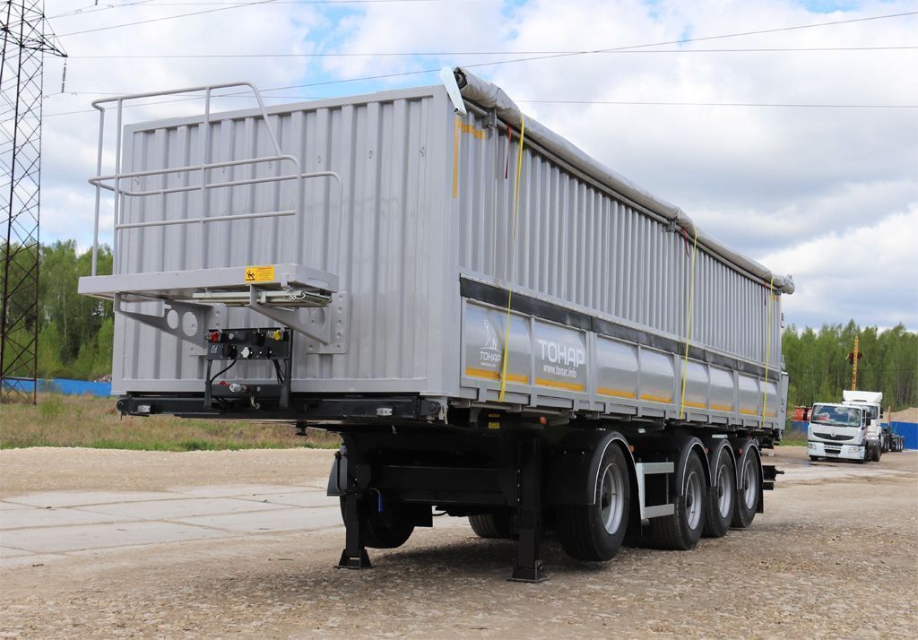 Кузов прямоугольной формы выполнен из профилированного прокатного листа и оснащен защитным тентом с механическим приводом. На каждой стороне кузова расположено по 4 разгрузочных лючка. Разгрузка полуприцепа осуществляется на боковые стороны посредством двух подпольных гидроцилиндров.