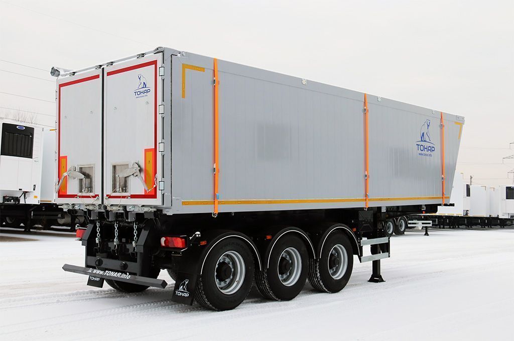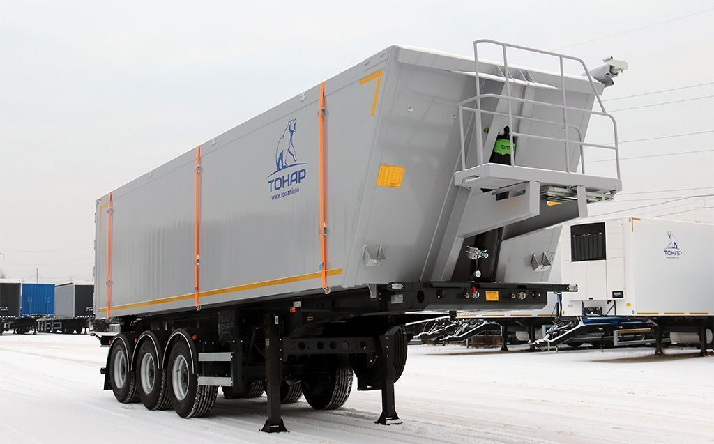 Кузов прямоугольной формы выполнен из качественного алюминия и оснащен защитным тентом с механическим приводом. Задний борт Тонар-9594 комбинированный и имеет дополнительные разгрузочные лючки.