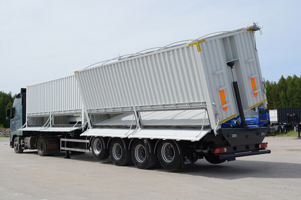 Двухсекционный самосвальный полуприцеп-семечковоз с объемом кузова 68 куб.м.